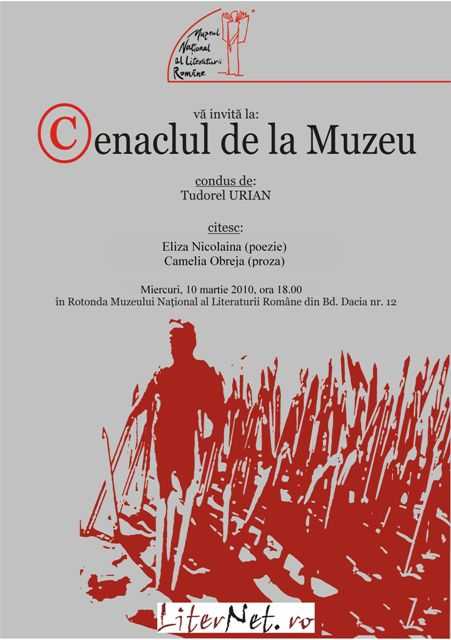Astăzi, 10 martie 2010, ora 18:00, în Sala Rotonda a Muzeului Naţional al Literaturii Române din Bucureşti are loc o nouă şedinţă a Cenaclului de la Muzeu. Moderator: criticul literar Tudorel Urian. Invitaţi: Eliza Nicolăină şi Camelia Obreja.