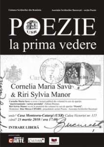 Astăzi, 23 martie 2010, ora 17:00, în Sala Oglinzilor a Casei Monteoru-Catargi (sediul Uniunii Scriitorilor din România) de pe Calea Victoriei nr.115, are loc un recital inedit al poetelor Cornelia Maria Savu şi Riri Sylvia Manor în cadrul proiectului POEZIE LA PRIMA VEDERE.