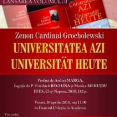Astăzi, 30 aprilie 2010, ora 11:00, în Foaierul Colegiului Academic  al Universităţii Babeş-Bolyai din Cluj, are loc lansarea volumului „Universitatea azi / Universität heute” a Cardinalului Zenon Grocholewski, Editura Efes. Cartea va fi prezentată publicului de Marton József, Sorin Marţian, Ioan Chirilă.