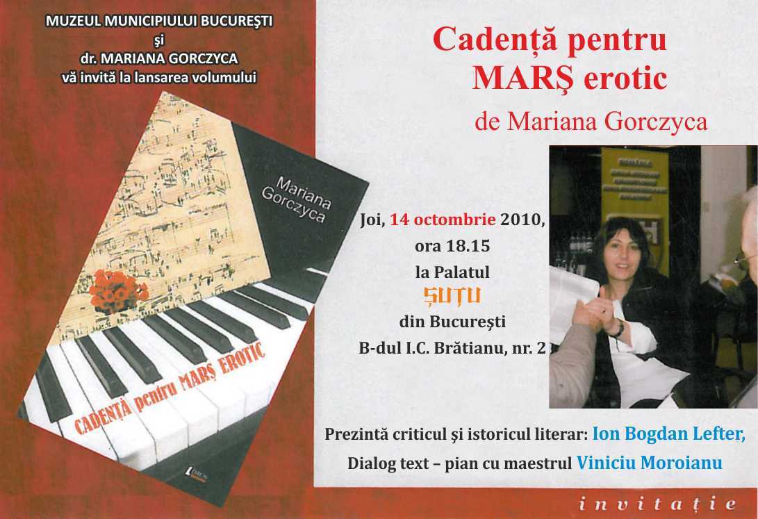 Astăzi, 14 octombrie 2010, ora 18:15, la Palatul Şuţu (B-dul I.C. Brătianu nr. 2, Bucureşti) are loc lansarea volumului semnat de Mariana Gorczyca, “Cadenţă pentru Marş erotic”, Editura Limes, 2010. Va prezenta critical şi istoricul literar Ion Bogdan Lefter, precedat de un moment “dialog text-pian” al maestrului Viniciu Moroianu.