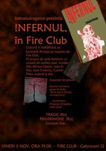 Vineri, 5 noiembrie 2010, ora 19.00, în Fire Club din Bucureşti, str. Gabroveni, nr 12, va avea loc un eveniment multiart: lansarea celui de-al doilea roman al scriitorului Leonard Ancuţa, „!NFERNUL”, Editura Tracus Arte, precum şi vernisarea expoziţiei colective Davinci Art School, cu lucrări semnate de Maria Stan, Mihaela Merla, Andreea Herzog, Marcela Roşoiu, Melek Cheosep, Cristina Dumitrescu şi Cătălina Soloveanu. Despre acestă nouă apariţie în literatura română vor vorbi scriitorii Dan Mircea Cipariu, Cosmin Perţa şi Ioan Es Pop. Totodată, vor fi prezenţi Ioan Cristescu, directorul editurii Tracus Arte, precum și Octavian Soviany, critic literar și poet.