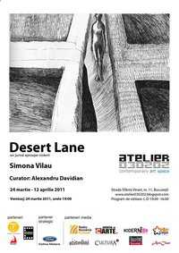 Joi, 24 martie 2011, ora 19:00, la Atelier 030202 (Sf. Vineri nr. 11, Bucureşti), va avea loc vernisajul expoziţiei “Desert Lane (un jurnal aproape violent)” de Simona Vilău. Curator: Alexandru Davidian. Expoziţia este deschisă în perioada 24 martie-12 aprilie 2011 şi prezintă desene și picturi de jurnal, gândite ca niște ficțiuni ale lucrurilor care “sunt” sau care “se întâmplă”. Fără scop „estic” (geografic) sau „estetic” (frumos), ele sunt un traseu cu borne vizuale, iar lupa ce se așează peste îndeamnă la sentimente contradictorii.