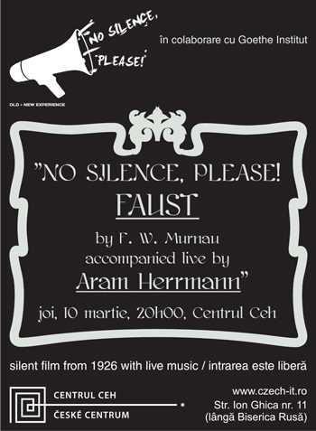 Joi, 10 martie 2011, ora 20:00, la Centrul Ceh (Str. Ion Ghica nr. 11, Bucureşti), va avea loc o nouă seară “No Silence, Please!”, cu proiecţia filmului mut “Faust” de F. W. Murnau (1926), acompaniat live de Aram Herrmann (pian).