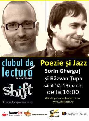 Sâmbătă, 19 martie 2011, ora 16:00, în Shift Pub (Eremia Grigorescu nr. 17, Bucureşti), are loc o nouă ediţie a Clubului de Lectură, cu tema “Poezie şi Jazz”. Invitaţi: scriitorii Sorin Gherguţ şi Răzvan Ţupa. Amfitrion: Andrei Ruse.