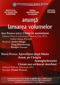 Joi, 21 aprilie 2011, ora 12:30, în curtea Colegiului Academic al Universtăţii Babeş-Bolyai din Cluj, vor avea loc lansări multiple: “China în ascensiune”, editor Ana Pantea, Presa Universitară Clujeană, şi volumele “Apocalipsa după Marta”, “Acasă, pe Câmpia Armaghedonului”, „Cioran sau un trecut deocheat” de Marta Petreu, Editura Polirom. Volumele vor fi prezentate de Andrei Marga, Feng Shaozhoeng, Pompei Cocean şi Ovidiu Pecican. Evenimentul este organizat de Universitatea Babeş-Bolyai, Institutul de Cercetări Europene, Presa Universitară Clujeană, alaturi de Editura Polirom.