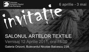 În perioada 6 aprilie-3 mai 2011, la Galeria de Artă “Orizont” din Bucureşti, va avea loc expoziţia de grup “Salonul Artelor Textile”, eveniment organizat de Uniunea Artiştilor Plastici din România. Vernisajul expoziţiei va avea loc marţi, 12 aprilie 2011, ora18:00.