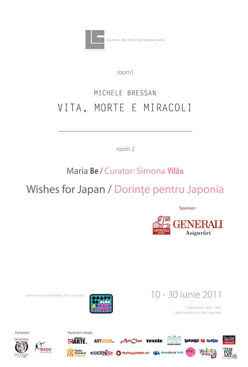 Vineri, 10 iunie 2011, ora 19:00, în cadrul Nopţii Albe a Galeriilor, la LC Foundation (Calea Victoriei nr. 25, Bucureşti), va avea loc un eveniment dubu. Vor fi prezentate expoziţiile “Vita, Morte e Miracoli – scena unei crime perfecte” de Michele Bressan, şi „Wishes for Japan-Dorinţe pentru Japonia” de Maria Be. Textele curatoriale sunt semnate de Simona Vilău. În cadrul NAG#5, expoziţiile pot fi vizitate în intervalul orar 19:00- 04:00, iar în cursul lunii iunie, până pe 30 iunie 2011.