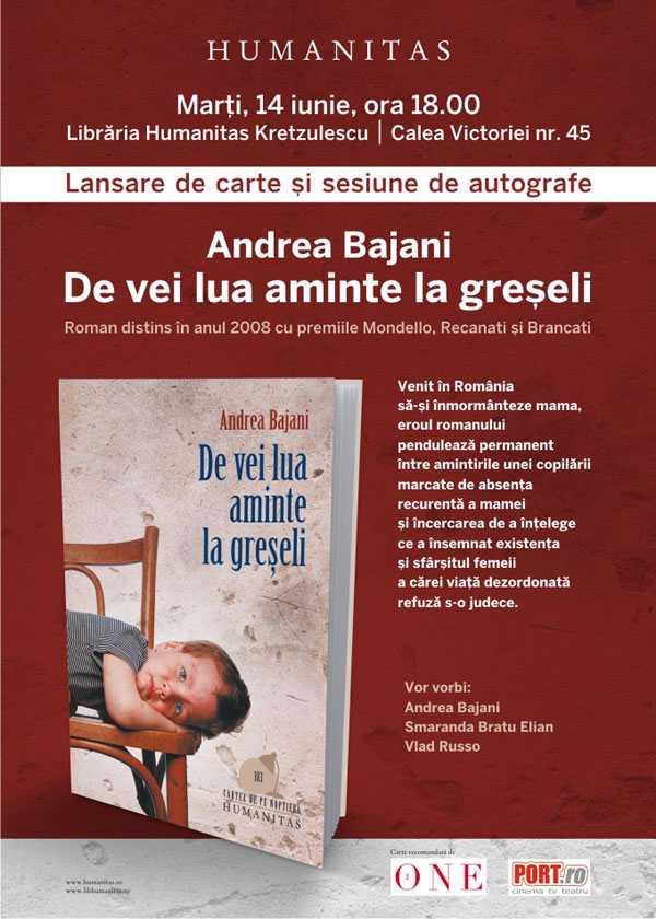 Marţi, 14 iunie 2011, Andrea Bajani lansează la librăria Humanitas Kretzulescu romanul „De vei lua aminte la greşeli”, un roman distins în anul 2008 cu premiile Mondello, Recanati şi Brancati.
