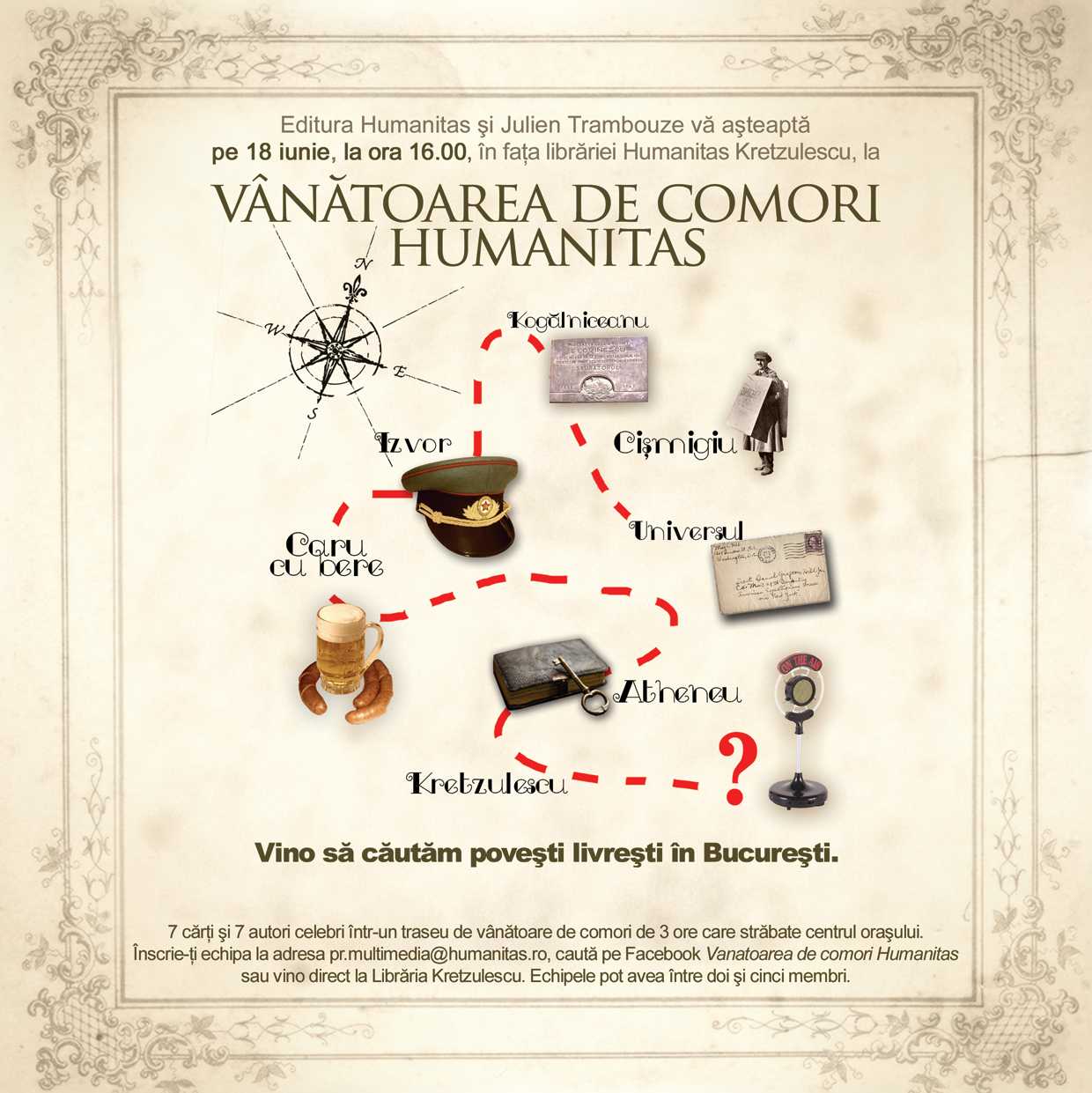 Editura Humanitas a pus la cale o „vânătoare de comori” prin Bucureşti în urma căreia participanţii vor descoperii, în alt mod, un număr de şapte cărţi. Jocul va începe sâmbătă, 18 iunie 2011, la ora 16.00, în faţa librăriei Humanitas Kretzulescu şi se joacă în echipe formate din 2 până la 5 membri.