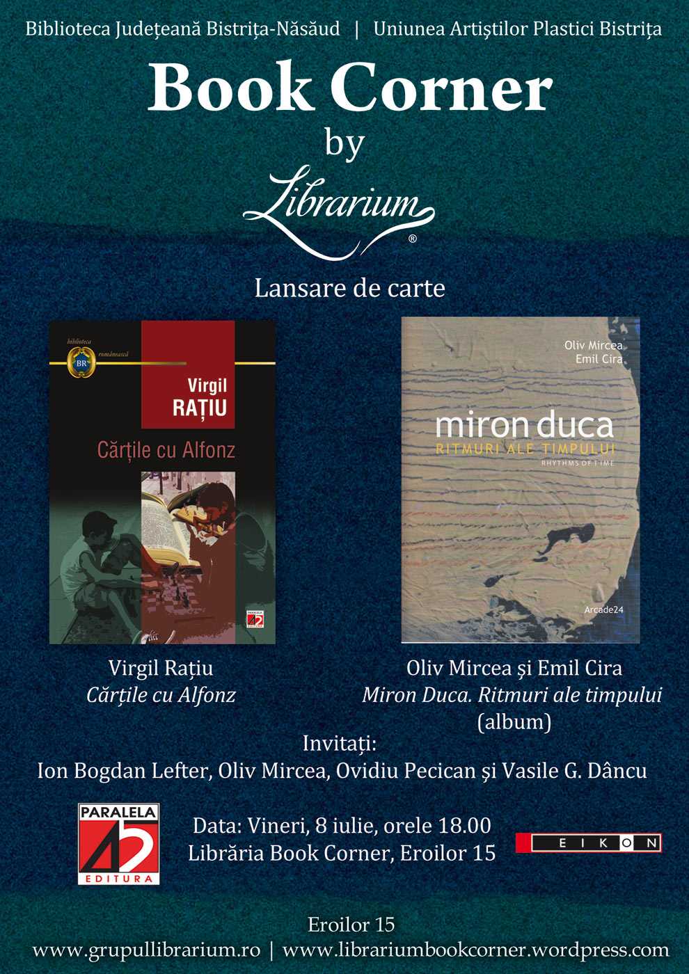 Vineri, 8 iulie 2011, de la ora 18:00, la Book Corner – Librarium (Str. Eroilor nr. 15, Cluj), va avea loc o dublă lansare de carte: romanul „Cărţile lui Alfonz” de Virgil Raţiu (Editura Paralela 45) şi albumul de artă „Miron Duca. Ritmuri ale timpului” de Oliv Mircea şi Emil Cira (Editura Eikon). Evenimentul este organizat de Biblioteca Judeţeană Bistriţa-Năsăud şi Uniunea Artiştilor Plastici Bistriţa.