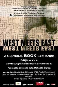 În perioada 10-28 octombrie 2011, între orele 10:00-18:00, de luni până vineri, la Sala de Expoziţii “Constantin Brâncuşi” – Palatul Parlamentului din Bucureşti, poate fi vizitată expoziţia internaţională WEST MEETS EAST – A Cultural Book Exchange”, curator: Daniela Frumuşeanu. Proiectul “WEST MEETS EAST-A Cultural Book Exchange” are ca scop schimbul de idei, cunoştinţe şi inspiraţie între artişti care aparţin unor continente şi sisteme socio-culturale diferite. Baza proiectului o constituie colaborarea pe plan artistic începută în aprilie 2009, dintre Daniela Frumuşeanu (Bucureşti, România) şi Joanne R. Luongo (Warwick, U.S.A.). În urma acestei colaborări au rezultat  24 de cărţi-obiect, care au parcurs drumul dintre America şi România timp de aproape 2 ani (între 2009-2011). Vernisajul expoziţiei “WEST MEETS EAST – A Cultural Book Exchange”, Bucureşti 2011, va avea loc luni, 10 octombrie, ora 17:00 la Sala de Expoziţii “Constantin Brâncuşi” (Palatul Parlamentului), Str. Izvor, Nr. 3, Bucureşti. În cadrul vernisajului va fi prezentată instalaţia audio „Poems without Book”, autor Carmen Emanuela Popa, studentă anul II, Universitatea Naţională de Arte Bucureşti, Facultatea de Arte Decorative şi Design. Recită actorul George Hodor. Moment artistic realizat cu sprijinul „Lumiére Artists”.  Prezintă: criticul şi istoricul de artă Mihaela VARGA.