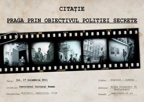 Joi, 17 noiembrie 2011, la Institutul Cultural Român din Bucureşti, cu ocazia aniversării Revoluţiei de catifea din Cehoslovacia, va avea loc evenimentul „Praga prin obiectivul Poliţiei Secrete”, cu discuţii, expoziţie şi proiecţie de film.