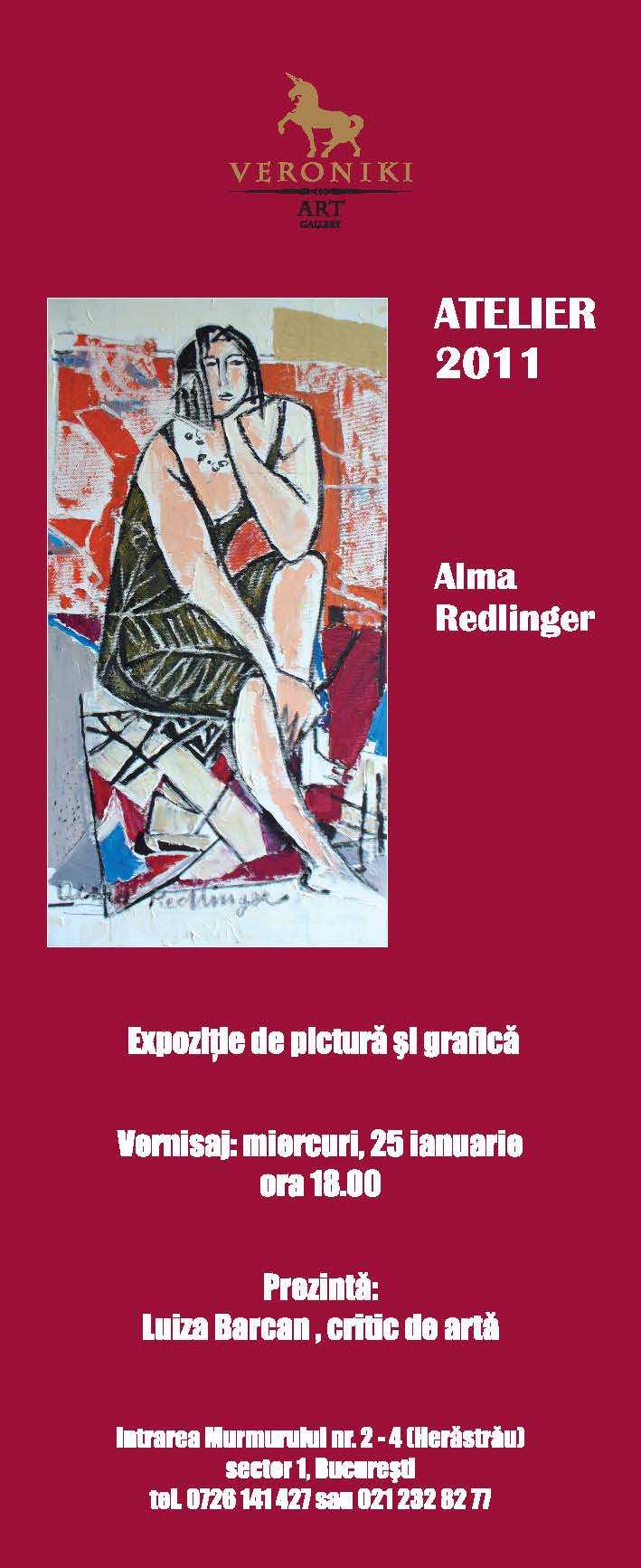Miercuri, 25 ianuarie 2012, ora 18:00, la Veroniki Art (Intrarea Murmurului nr 2, Bucureşti), va avea loc vernisajul expoziţiei Almei Redlinger. Lucrările de pictură şi grafică vor fi prezentate de criticul de artă Luiza Barcan. Expoziţia va fi deschisă publicului până la 26 februarie 2012.