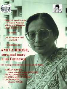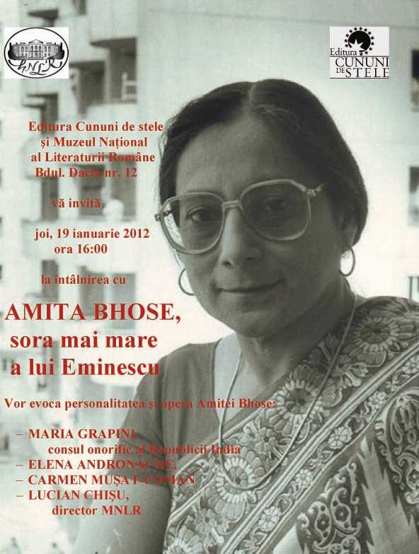Joi, 19 ianuarie 2012, ora 16:00, la Muzeul Naţional al Literaturii Române (Bdul Dacia nr. 12, Bucureşti), va avea loc evenimentul intitulat „Amita Bhose, sora mai mare a lui Eminescu”, organizat de Editura Cununi de stele. Vor evoca opera și personalitatea Amitei Bhose: Maria Grapini, consul onorific al Republicii India, invitat special al editurii Cununi de stele; Elena Andronache, fostă studentă şi colaboratoare a Amitei Bhose; Carmen Muşat-Coman, fostă studentă, colaboratoare a Amitei Bhose, director editorial Cununi de stele; Lucian Chișu, director al Muzeului Național al Literaturii Române.