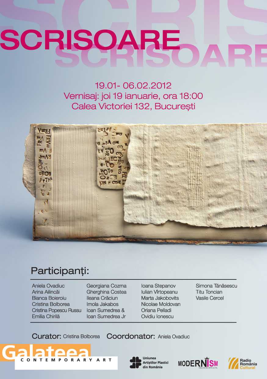 Joi, 19 ianuarie 2012, ora 18:00, la Galeria Galateea (Calea Victoriei 132, Bucureşti), va avea loc vernisajul expoziţiei „Scrisoare”, care reuneşte lucrări ceramice şi mix media realizate de peste douăzeci de artişti, membri ai Uniunii Artiştilor Plastici din România. Curator: Cristina Bolborea. Coordonator: Aniela Ovadiuc. Expun artiştii:Aniela Ovadiuc, Arina Ailincăi, Bianca Boeroiu, Cristina Bolborea, Cristina Popescu Russu, Emilia Chirilă, Georgiana Cozma, Gherghina Costea, Ileana Crăciun, Imola Jakabos, Ioan Sumedrea senior, Ioan Sumedrea junior, Ioana Stepanov, Iulian Vîrtopeanu, Marta Jakobovits, Nicolae Moldovan, Oriana Pelladi, Ovidiu Ionescu, Simona Tănăsescu, Titu Toncean, Vasile Cercel. Parteneri media: Modernism.ro, Radio România Cultural, AgenţiadeCarte.ro, Revista Cultura. Expoziţia va fi deschisă până luni, 6 februarie 2012.
