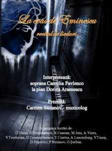 Miercuri, 25 ianuarie, de la ora 19.00, în foaierul Teatrului “Masca”, va avea loc recitalul de lieduri “La ceas de Eminescu” în interpretarea sopranei Camelia Pavlenco alături de pianista Dorina Arsenescu. Evenimentul face parte din programul “La Bibliotecă” al instituţiei gazdă.