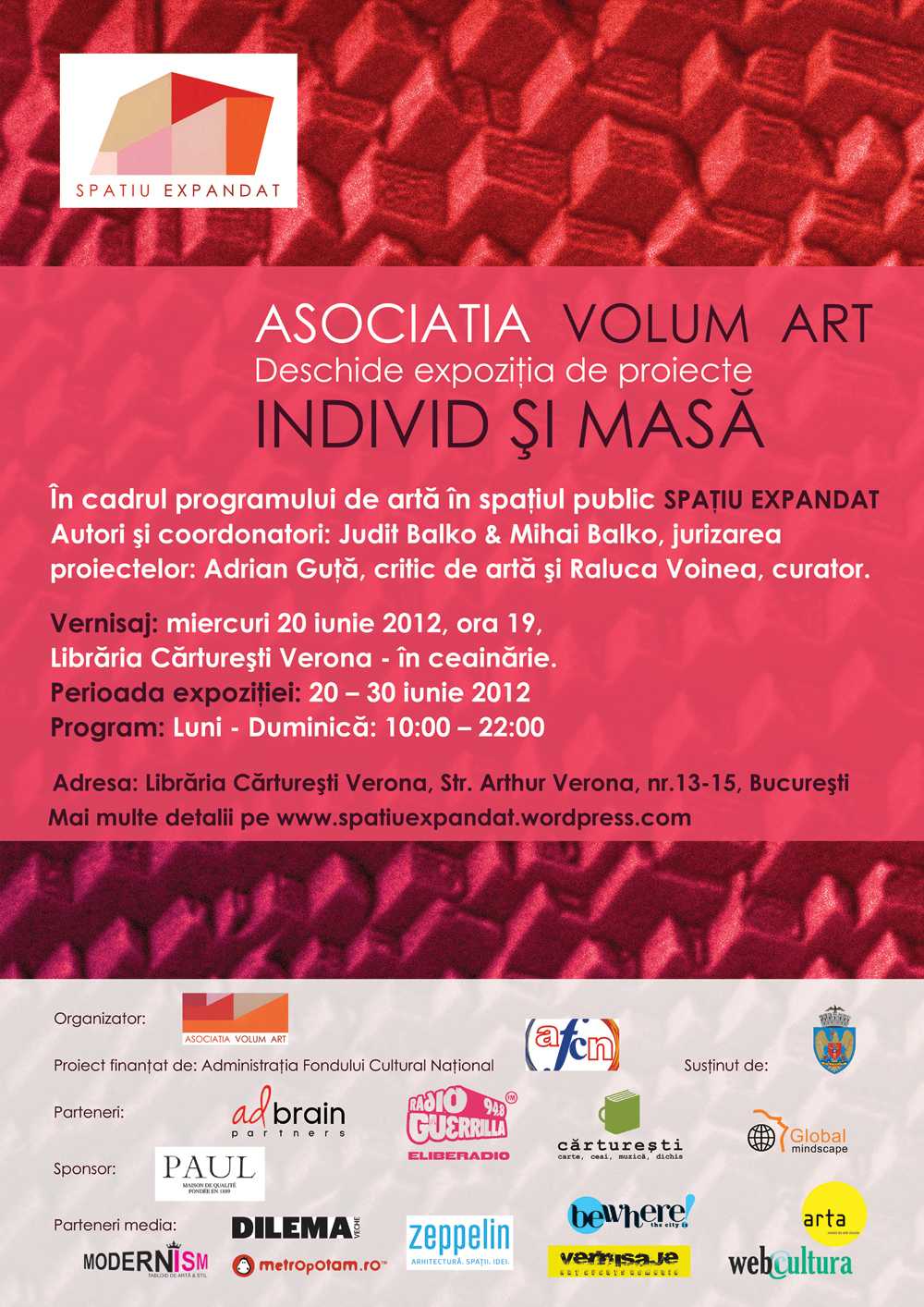 Miercuri, 20 iunie 2012, de la ora 19.00, la Librăria Cărtureşti Verona din Bucureşti, în Ceainărie, va avea loc vernisajul expoziţiei de proiecte „Individ şi masă”. Proiectele de artă pentru spaţiul public au fost propuse de artişti români din toată ţara în urma apelului lansat de Asociaţia Volum Art în perioada 19 aprilie– 20 mai 2012 în cadrul programului „Spaţiu expandat”.