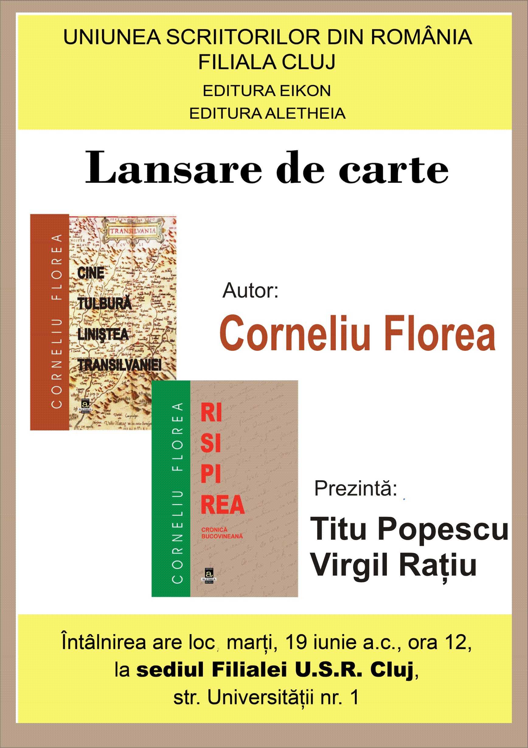 Marţi, 19 iunie 2012, de la ora 12.00, la sediul filialei Cluj a Uniunii Scriitorilor din România, vor fi lansate două cărţi de Corneliu Florea: “Cine tulbură liniştea Transilvaniei” şi “Risipirea. O cronică bucovineană”, ambele apărute la editura Aletheia. Prezintă Titu Popescu şi Virgil Raţiu.