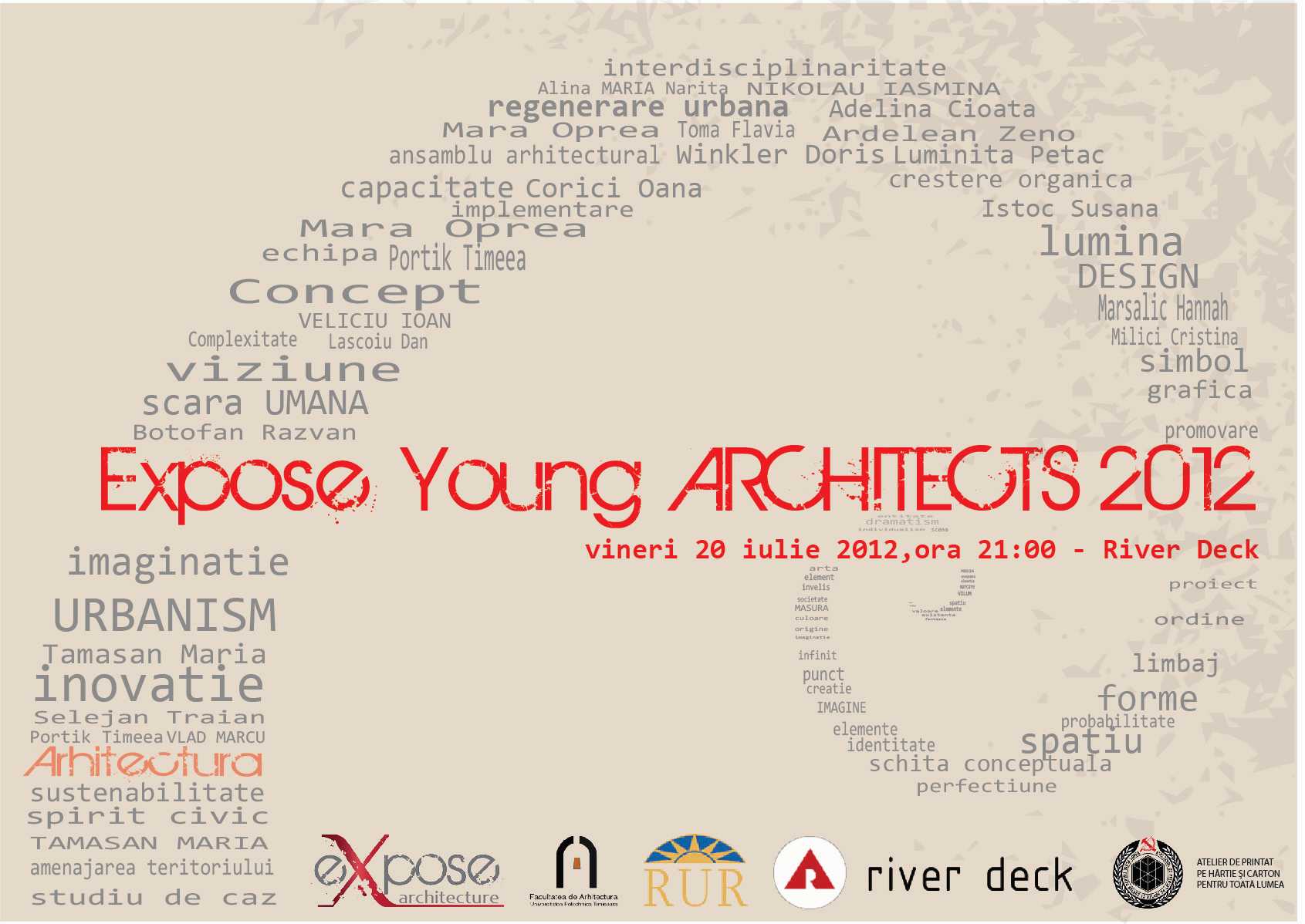 Vineri, 20 iulie 2012, de la ora 21.00, la River Deck Timișoara, se va desfășura seara de premiere a tinerilor arhitecți, din cadrul evenimentului Expose Young Architects. Organizatori sunt River Deck și Asociația Expose Architecture, împreună cu o serie de parteneri și susținători.