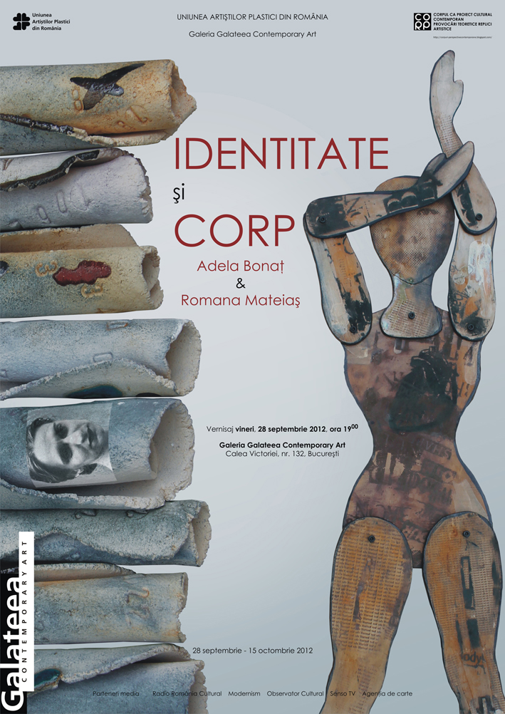 Vineri, 28 septembrie 2012, ora 19:00, la Galeria Galateea din Bucureşti (Calea Victoriei 132) va avea loc vernisajul expoziţiei „Identitate şi corp”. Expun Adela Bonaţ şi Romana Mateiaş. Expoziţia poate fi vizitată în perioada 28 sept. – 15 oct. 2012. Manager galerie: Raluca Băloiu.