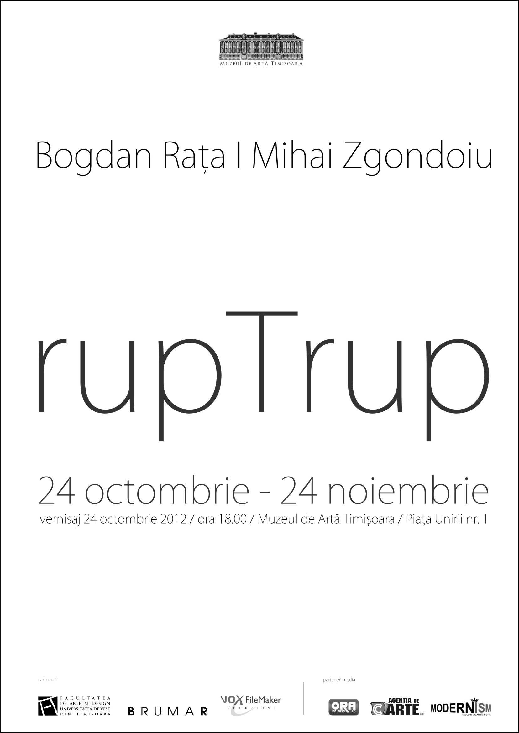 Miercuri, 24 octombrie 2012, ora 18.00, la Muzeul de Artă Timişoara va avea loc vernisajul expoziţiei „rupTrup” de Bogdan Rața & Mihai Zgondoiu. Expoziţia poate fi vizitată în perioada 24 octombrie-24 noiembrie 2012.