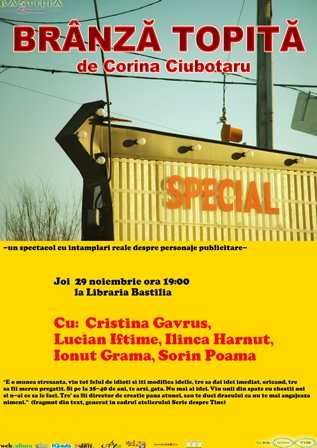 Joi, 29 noiembrie 2012, de la ora 19.00, la Librăria Bastilia, Piața Romană nr. 5, se va citi în lectură publică, „Brânză topită”, un text scris în cadrul atelierului Scrie despre tine de Corina Ciubotaru. Textul a fost prezentat în lectură publică prima dată în Luna Scrie despre Tine, din primăvară asta, şi este o piesă despre publicitate şi ce înseamnă să fii creativ, dar mai ales ce înseamnă să fii special.