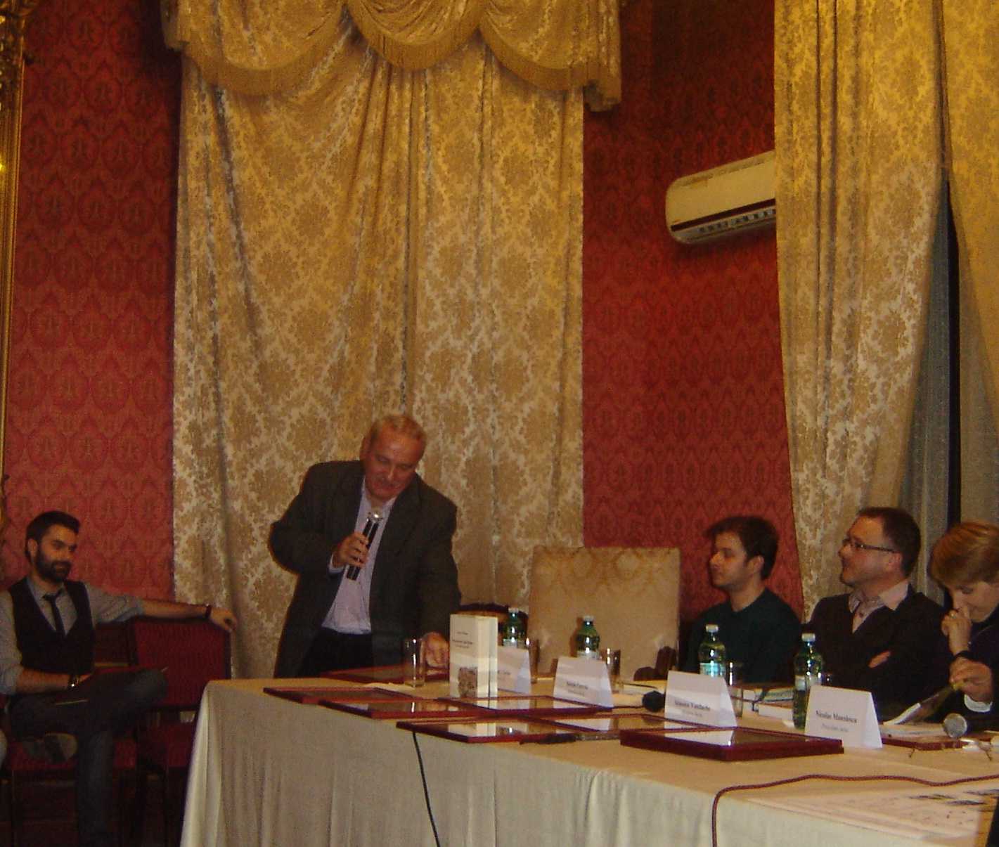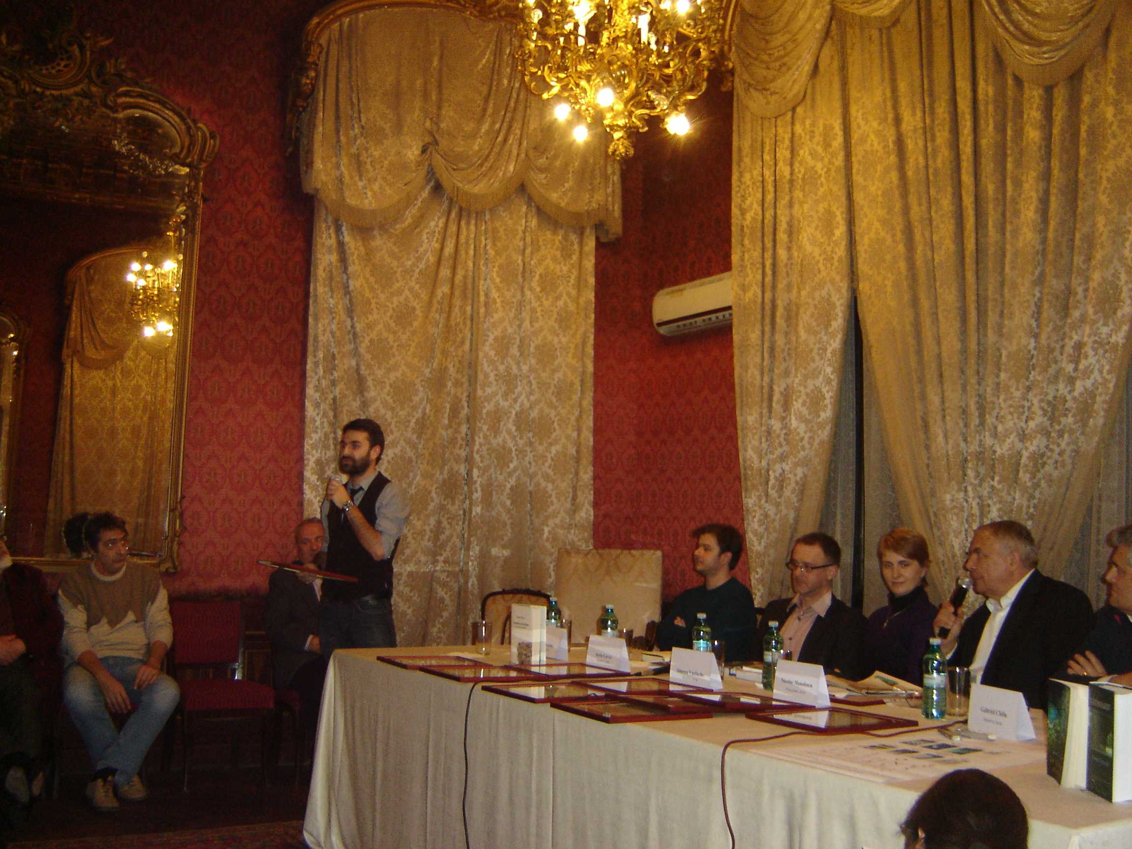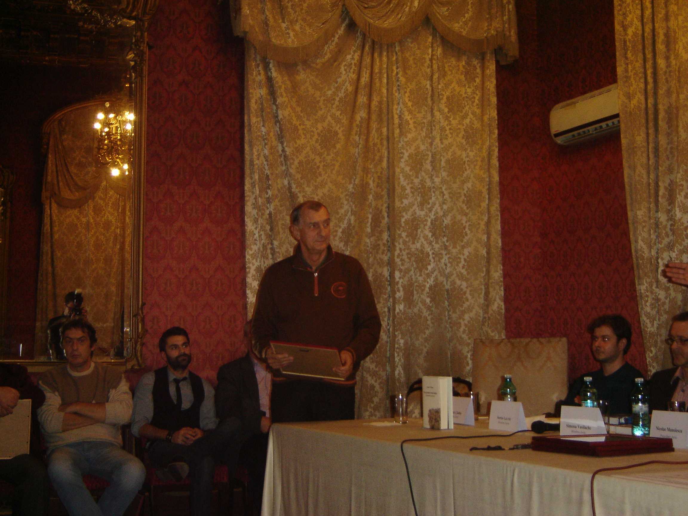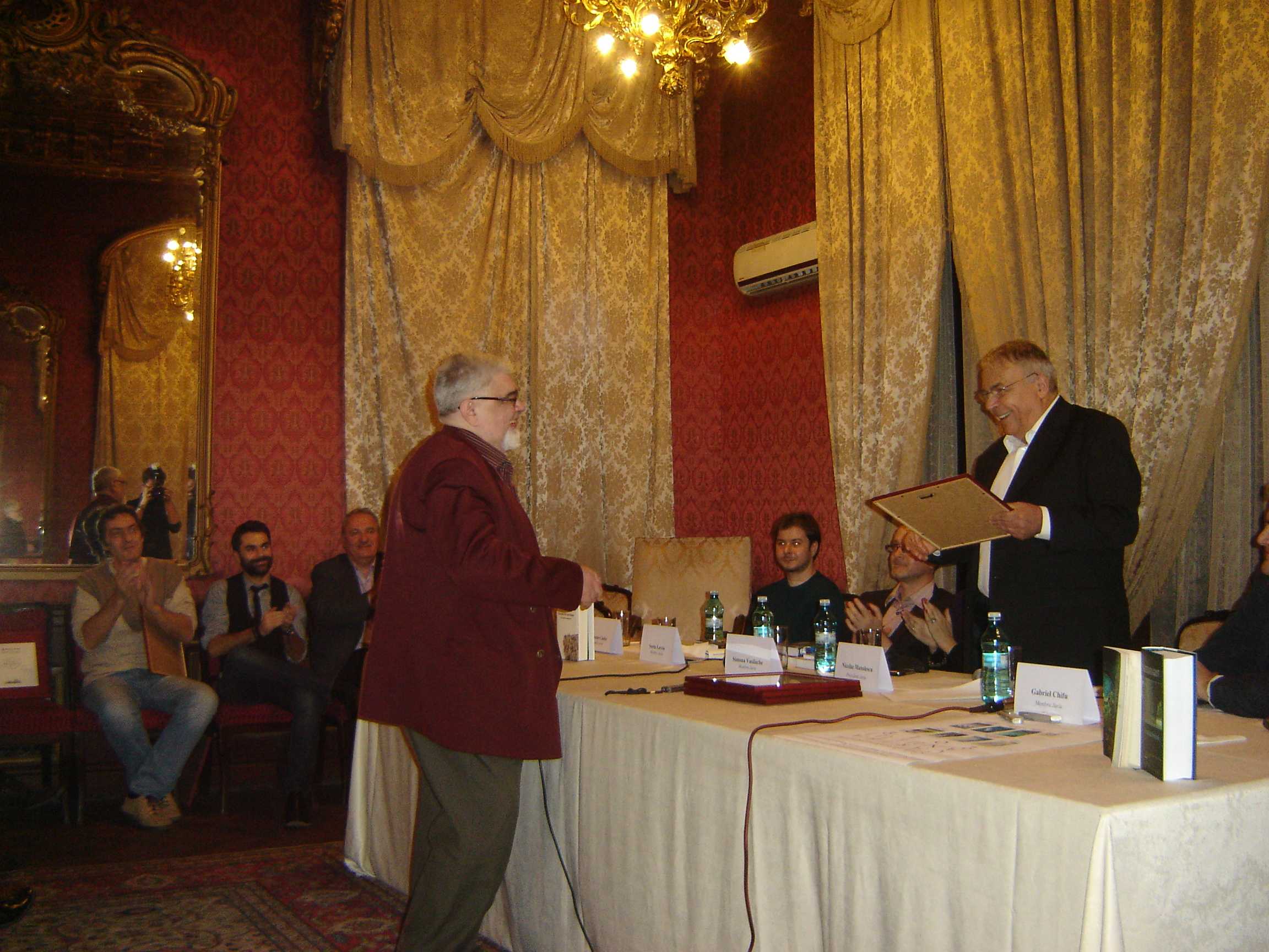 ”Anul acesta, Premiul pentru Cartea anului al României Literare îl vedeți aici și nu în locul în care l-am decernat până acum, la Fundația Anonimul. De data aceasta, după expirarea contractului cu ei, ne-am mutat în sediul nostru, iar banii vin, de data asta, din partea Guvernului României. Ați văzut nominalizările pe care le-am publicat, în urma dezbaterilor crâncene. Ca și în alți ani, sunt anumite cărți pe care nu le-am prins pentru că au apărut acum la târg și pe care, din păcate, nu le-am putut aștepta pentru că există anumite constrângeri, nu mai putem deconta după anumite date. Le vom lua în considerare anul viitor. Au apărut, în ultimul moment, câteva cărți cu adevărat foarte bune. Ca de obicei, fiecare dintre noi va prezenta câte una sau mai multe cărți, pentru că noi suntem mai puțini decât cărțile nominalizate. Primul nominalizat este Marius Chivu pentru volumul de versuri ”Vântureasa de plastic”, editura Brumar. Comsin Ciotloș va spune câteva cuvinte.” (Nicolae Manolescu)