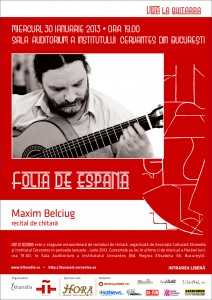 Miercuri, 30 ianuarie 2013, ora 19.00, în Sala Auditorium a Institutului Cervantes din Bucureşti (Bd. Regina Elisabeta 38), va avea loc un recital de chitară spaniolă susţinut de Maxim Belciug. Intitulat „Folía De España”, concertul propune o incursiune în etosul muzical iberic, de la acordurile renascentiste ale lui Luis de Milán până la sonorităţile moderne semnate de Joaquín Rodrigo, trecând prin epoca de aur a chitarei, deschisă de Fernando Sor şi împlinită de Francisco Tárrega. Intrarea este liberă.