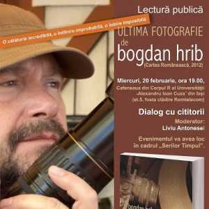 Miercuri, 20 februarie 2013, ora 19.00, în Cafeneaua din Corpul R al Universităţii „Alexandru Ioan Cuza” din Iaşi, Bogdan Hrib va citi în cadrul proiectului „Serile Timpul” din cel mai nou roman al său, “Ultima fotografie”, apărut recent la Cartea Românească. Lectura va fi urmată de un dialog cu cititorii. Moderator: Liviu Antonesei.