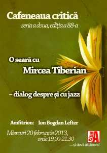 20 februarie la Cafeneaua critică pentru o discuţie despre muzică şi despre cariera sa, despre experimentele sale jazzistice, despre lumea jazzului şi despre jazzul lumii. Cea mai recentă apariţie editorială semnată Mircea Tiberian: Jazz Inside Out (coeditare Tracus Arte, Bucureşti şi Eikon, Cluj, 2012).