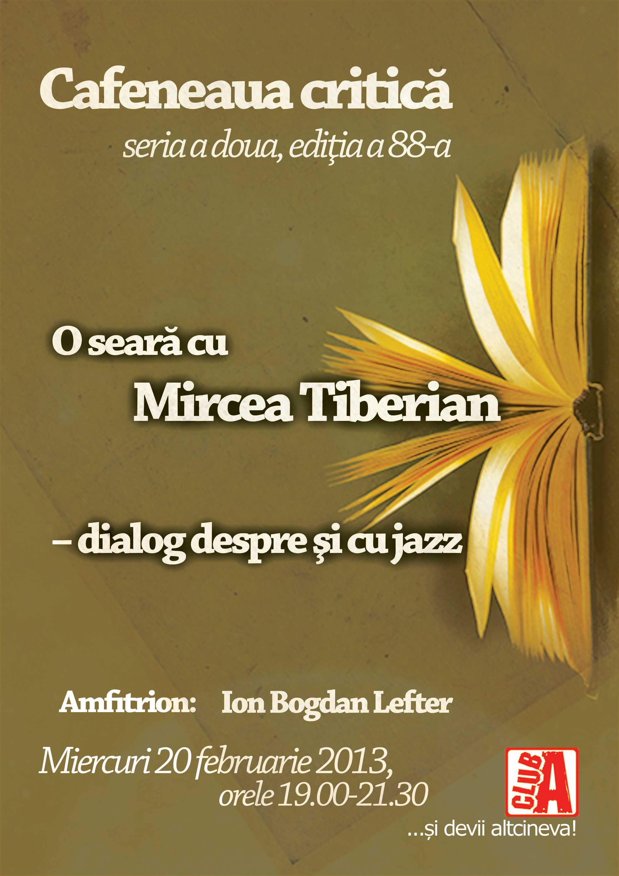 Miercuri, 20 februarie 2013, de la ora 19.00, la Club A (Bucureşti, Str. Blănari Nr. 14, între Universitate şi Piaţa Unirii, vizavi de Sfîntul Gheorghe), la Cafeneaua Critică va avea loc o întâlnire cu Mircea Tiberian, într-un dialog despre și cu jazz. Amfitrion: Ion Bogdan Lefter.