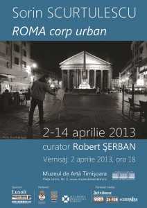 Marți, 2 aprilie 2013, de la ora 18.00, la Muzeul de Artă din Timişoara (Palatul Baroc, Piaţa Unirii nr.1), va avea loc vernisajul expoziţiei “Roma, corp urban” a artistului vizual Sorin Scurtulescu, fost bursier “Vasile Pârvan” la Accademia di Romania din Roma. Curator: Robert Șerban. În cadrul vernisajului vor lua cuvântul Marcel Tolcea, directorul Muzeului de Artă Timişoara şi Robert Şerban, curatorul expoziției. Expoziţia va fi deschisă până în data de 14 aprilie 2013 şi poate fi vizitată zilnic, între orele 10-18 (lunea închis).