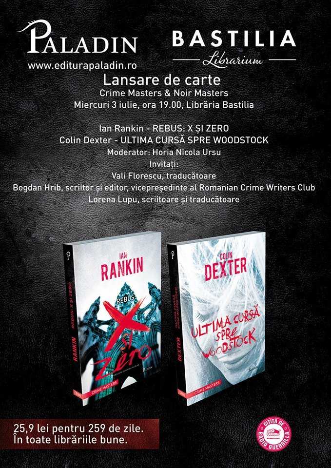 Miercuri, 3 iulie 2013, de la ora 19.00, la Librăria Bastilia din București, va avea loc lansarea unei noi colecţii a editurii Paladin. ”Crime Masters” va reuni scrierile celor mai importanţi autori ai genului, clasici şi contemporani deopotrivă. Primele romane apărute în colecţia ”Crime Masters” sunt ”Rebus: X şi zero” de Ian Rankin (în traducerea lui Mircea Pricăjan) şi ”Ultima cursă spre Woodstock” de Colin Dexter (în traducerea Lorenei Lupu).