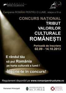 Concursul „Tribut Valorilor Culturale Româneşti”, un concurs naţional care reprezintă a treia etapă a campaniei naţionale de responsabilitate socială „Români pentru o lume”, îşi propune să promoveze valorile naţionale şi să încurajeze tânăra generaţie interesată de domeniul cultural. Concursul se va desfăşura online pe website-ul campaniei www.romanipentruolume.ro şi pe pagina de Facebook „Români pentru o lume”. Perioada desfăşurării concursului: 2 septembrie – 28 noiembrie 2013.