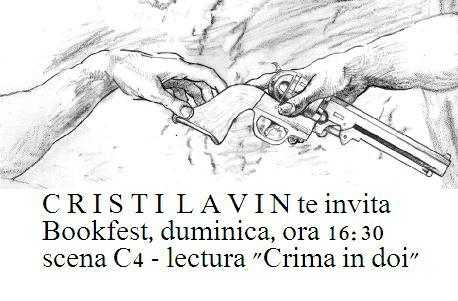 Duminică, 2 iunie 2013, de la ora 16.30, la Scena C 4 din cadrul Târgului Internațional de Carte Bookfest, ediția a VI-a, scriitorul Cristi Lavin va susține o lectură publică din romanul pe care îl pregătește, ”Crimă în doi”. Cristi Lavin a publicat roman, poezie, eseu, teatru, scenariu de film, romanul său anterior, ”Vikingul roz”, fiind inițial publicat în limba franceză. La șase luni după apariția în această formă, ”Vikingul roz” a apărut, în 2012, la editura Tracus Arte, în limba română, fiind lansat la Târgul de carte Gaudeamus – Carte de învățătură, ediția 2012.