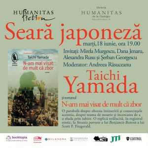 Marţi, 18 iunie 2013, ora 19.00, la Librăria Humanitas de la Cişmigiu (Bd. Regina Elisabeta nr. 38, Bucureşti), va avea loc o nouă seară japoneză dedicată scriitorului Taichi Yamada şi romanului “N-am mai visat de mult că zbor”, colecţia „Raftul Denisei”, Editura Humanitas Fiction. Vor participa la dezbatere Dana Jenaru, critic literar, Alexandra Rusu, editor Booktopia.ro, Mirela Murgescu şi Şerban Georgescu, profesori ai Centrului de Studii Româno-Japoneze din cadrul Universităţii Româno-Americane din Bucureşti. Moderatorul întâlnirii este Andreea Răsuceanu, redactor al Editurii Humanitas Fiction.