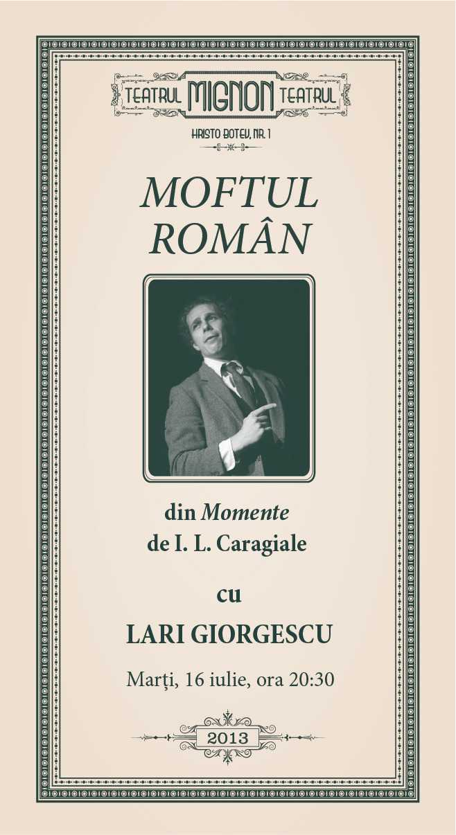 Marţi, 16 iulie 2013, ora 20:30, la Teatrul Mignon (Bucureşti), va avea loc spectacolul “Moftul român”, după “Momente” de I. L. Caragiale, cu actorul Lari Giorgescu.