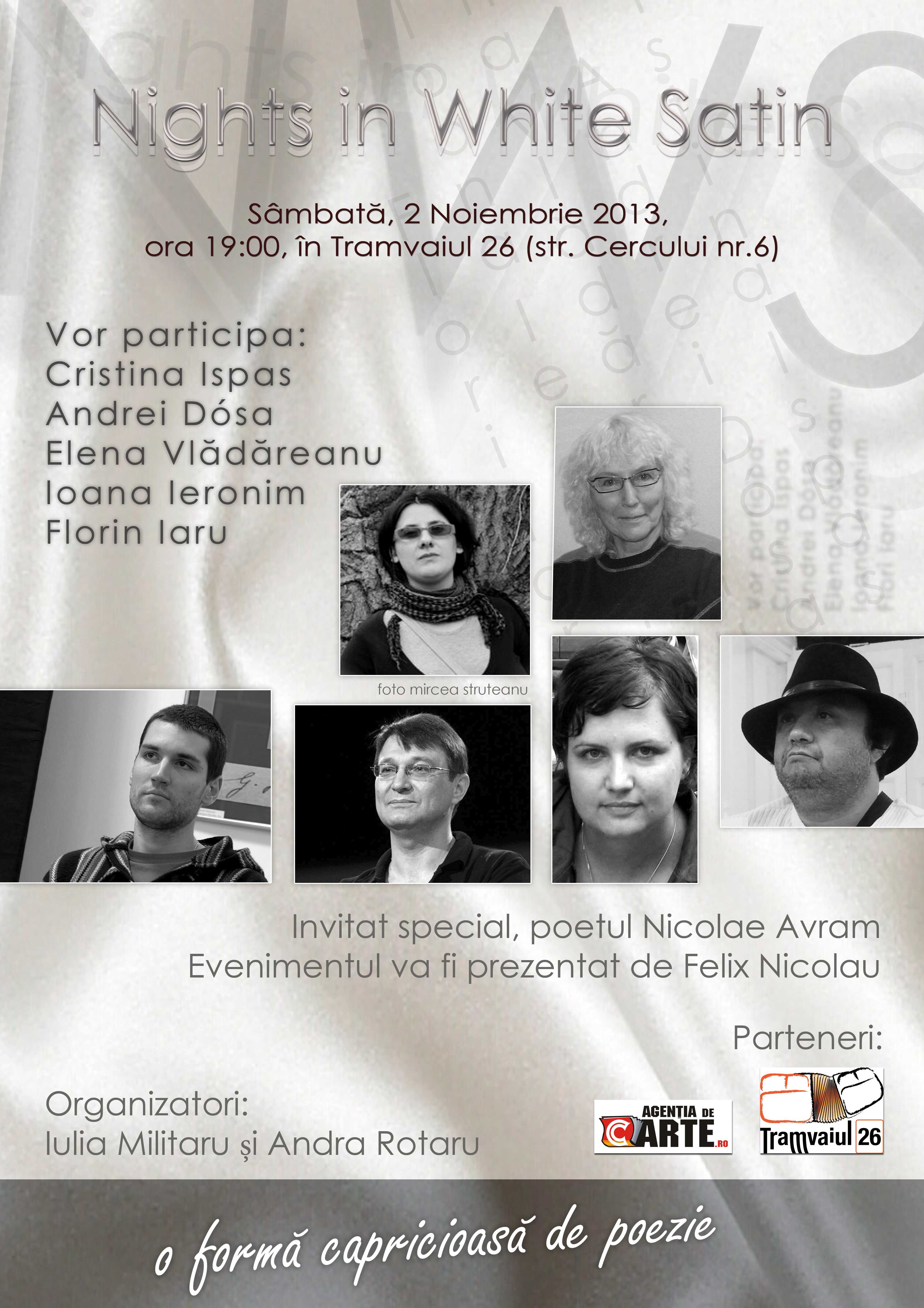 Sâmbătă, 2 noiembrie 2013, ora 19:00, în Tramvaiul 26 (Str. Cercului nr. 6, Bucureşti), va avea loc ediţia a III-a a evenimentului “Nights in White Satin – o formă capricioasă de poezie”. Invitaţi: Ioana Ieronim, Elena Vlădăreanu, Florin Iaru, Andrei Dósa, Cristina Ispas. Invitat special: Nicolae Avram. Moderator: Felix Nicolau. Seara de poezie “Nights in White Satin” îşi ia drept moto versurile formaţiei “Moody Blues”: “Nights in white satin, never reaching the end,/ Letters I’ve written, never meaning to send./ Beauty I’d always missed with these eyes before./ Just what the truth is, I can’t say anymore.”, încercând să ofere publicului un mic tablou din poezia contemporană. Organizatori: Iulia Militaru şi Andra Rotaru. Parteneri: Tramvaiul 26 şi AgenţiadeCarte.ro