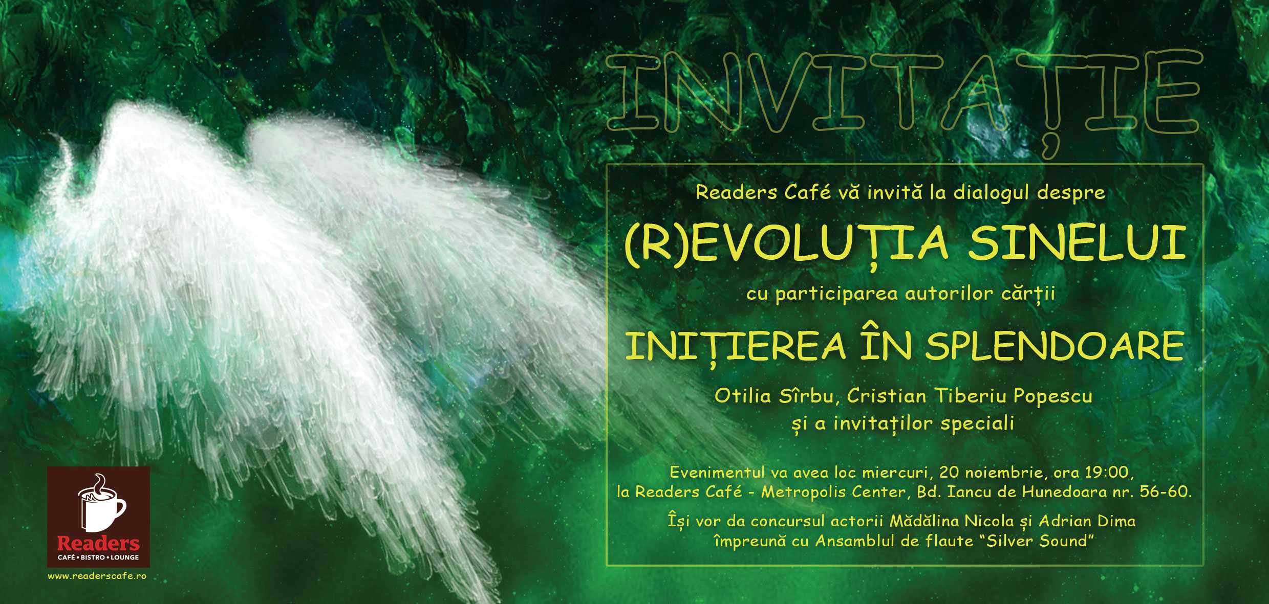 Miercuri, 20 noiembrie 2013, la Readers Café – Metropolis Center din Bucureşti (Bd. Iancu de Hunedoara, nr. 50-56), începând cu ora 19.00, va avea loc dialogul despre „(R)evoluţia sinelui”, mişcare de idei al cărei prim-impuls este cartea „Iniţierea în splendoare”, de Otilia Sîrbu şi Cristian Tiberiu Popescu, Editura Tracus Arte, a cărei lansare s-a produs la Sala Radio în urmă cu două luni, stârnind deja interesul criticii literare şi interesul publicului larg. La dialog, moderat de Dan Mircea Cipariu, vor participa distinse personalităţi, dinăuntrul şi dinafara lumii literare. Îşi vor da concursul actorii Mădălina Nicola şi Adrian Dima, precum şi Ansamblul de flaute „Silver Sound”. AgenţiadeCarte.ro este partenerul media al evenimentului.