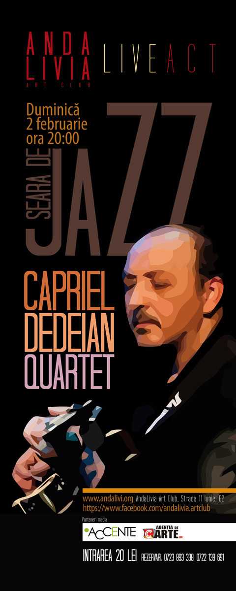 Duminică, 2 februarie, 2014, de la ora 20:00, la Andalivia Art Club (Str. 11 Iunie nr. 62, Bucureşti) va avea loc o “Seară de Live Jazz” alături de Capriel Dedeian Quartet (Capriel Dedeian – guitar; Răzvan Cipcă – guitar; Ion Vârlan – bass; Ştefan Benedict – drums). AgențiadeCarte.ro este partener media al evenimentului.