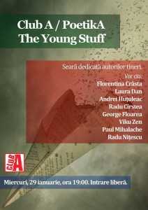 Miercuri, 29 ianuarie 2014, începând cu ora 19.00, la Club A din București, în cadrul proiectului PoetikA, este organizată o seară de poezie tânără, dedicată autorilor tineri. Vor citi Florentina Crâsta, Laura Dan, Andrei Huțuleac, Radu Cîrstea, George Floarea, Viku Zen, Paul Mihalache și Radu Nițescu. Moderator și organizator: Leonard Ancuța. Florentina Crâsta a câștigat de curând premiul cel mare la concursul de debut ”Incubatorul de Condeie”; Andrei Huțuleac și Radu Cîrstea vor debuta în curând la editura Karth, George Floarea a debutat anul trecut la Casa de Editură Max Blecher, Laura Dan, Viku Zen și Paul Mihalache au publicat la Tracus Arte, iar Radu Nițescu la Casa de Pariuri Literare.