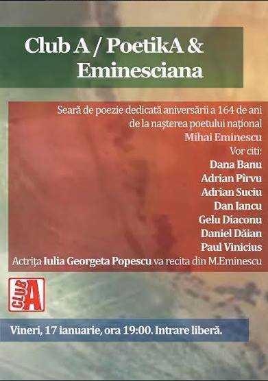 Vineri, 17 ianuarie 2014, începând cu ora 19.00, în Club A din București, va avea loc prima întâlnire din seria de evenimente literare reunite sub numele de PoetikA, de data aceasta o ediție specială: PoetikA & Eminesciana. O seară de poezie dedicată aniversării a 164 de ani de la nașterea poetului național Mihai Eminescu. Vor citi Dana Banu, Adrian Pîrvu, Adrian Suciu, Dan Iancu, Gelu Diaconu, Daniel Dăian și Paul Vinicius. Amfitrion: Leonard Ancuța.