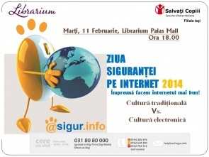 Marți, 11 februarie 2014, de la ora 18.00, la Librarium Palas din Iași (Palas Shopping Mall, parter), va avea loc o întâlnire cu tema ”Cultură tradiţională vs. Cultură electronic”, organizată împreună cu Asociația Salvați Copiii, cu ocazia Zilei Siguranței pe Internet. Evenimentul se adresează adolescenților. Invitaţi speciali: Conf. Univ. Cătălin Constantinescu. Corina Mighiu, psiholog Salvați Copiii Iași.