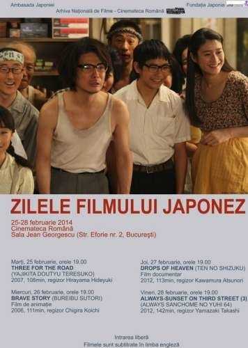 În perioada 25-28 februarie 2014, la Cinemateca Română, sala Jean Georgescu, din București, se vor desfășura ”Zilele filmului japonez”. Organizatorii evenimentului sunt Ambasada Japoniei şi Japan Foundation în colaborare cu Arhiva Naţională de Filme – Cinemateca Română. Toate filmele încep de la orele 19.00 şi sunt subtitrate în limba engleză.