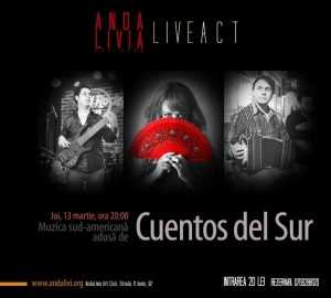 Joi, 13 martie 2014, de la ora 20.00, la Andalivia Art Club (Str. 11 Iunie nr. 62, Bucureşti) va avea loc un concert pe ritmuri de trova – bolero – tango – milonga – valscriollo susţinut de trei performeri: Ioana Ernea – voce; Alexandru Nucă – chitară, voce; Raubel Torres Gonzales – bongos, bas. Cei trei muzicieni se reunesc în evenimentul  ”Cuentos del Sur (Poveşti din Sud)”.