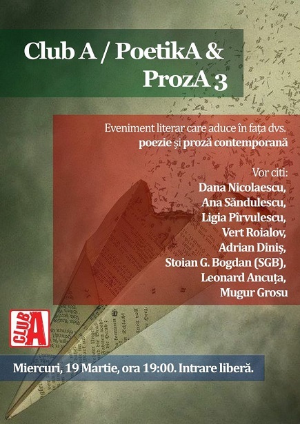Miercuri, 19 martie 2014, de la ora 19.00, la Club A din București, va avea loc evenimentul PoetikA & ProzA, ediția a 3-a,un eveniment literar care aduce în fața publicului poezie și proză contemporană. Vor citi Dana Nicolaescu, Ana Săndulescu, Ligia Pîrvulescu, Vert Roialov, Adrian Diniș, Stoian G. Bogdan (SGB), Leonard Ancuța și Mugur Grosu. Amfitrion și organizator: Leonard Ancuța. ”PoetiKa este o interfață directă între autori și public, un motiv puternic să redescoperim farmecul poeziei, să familiarizăm sau să educăm publicul, indiferent de vârstă cu noile canoane, direcții sau avangarde apărute în lirica românească, să prezentăm autorii consacrați sau să descoperim tinere talente și să le promovăm. Ne așteptăm să veniți cucreațiile proprii și să vă autopropuneți pentru edițiile care vor urma.” (Leonard Ancuța)