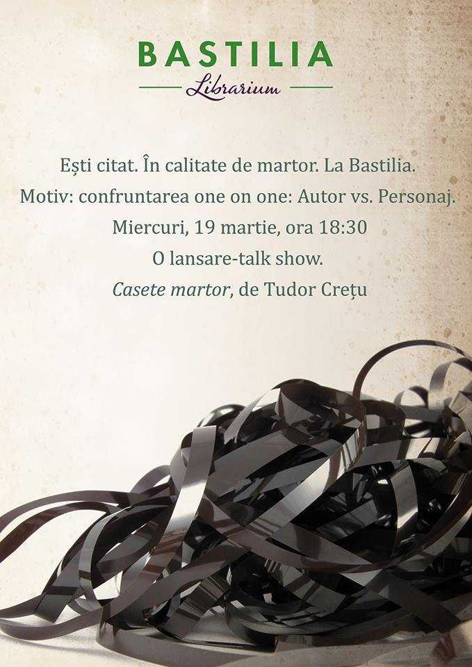 Miercuri, 19 martie 2014, de la ora 18:30, la librăria Bastilia (Piața Romană nr. 5, București), va avea loc o lansare talk-show a volumului ”Casete martor” (editura Tracus Arte, 2013), de Tudor Crețu. ” Se caută martori: lansare talk-show. One on one. Autor vs. Personaj. Un roman-reality show – horror de/la domiciliu (Casă) – al `sistemului de învățământ` (Clasă) – al Timișoarei de noapte (Eșiri & Ianuarie concav) – ETC (cu litere mari, neapărat)”, spune autorul.