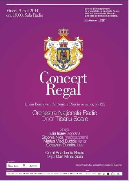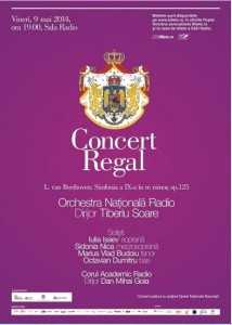 Vineri, 9 mai 2014, de la ora 19.00, la Sala Radio din București, va avea loc un concert la care vor fi prezenți și membrii Familiei Regale a României. Orchestra Națională Radio, sub bagheta dirijorului Tiberiu Soare, va interpreta Simfonia a IX-a de Beethoven. Va participa Corul Academic Radio, dirijor: Dan Mihai Goia. Evenimentul va avea loc în ajunul datei de 10 mai – sărbătoare a regalităţii în România. „Pentru mine fiecare concert este important, o ocazie de a prezenta în public rezultatul unor lungi perioade de analiză, reflecţie şi lucru împreună cu orchestra. Există totuşi evenimente speciale în viaţa oricărui dirijor, concerte pe care nu le uiţi o viaţă întreagă. E vorba de prima interpretare a unei lucrări-etalon din repertoriu, cum ar fi Simfonia a IX-a de Ludwig  van Beethoven. Pe 9 mai, la Sala Radio, va fi prima oară când voi interpreta această capodoperă, împreună cu muzicienii Orchestrei Naţionale Radio. Bineînţeles că de-a lungul anilor m-am apropiat constant de spiritul acestei simfonii, primele abordări de analiză datând încă din vremea studenţiei. Cred însă că o asemenea lucrare cere nu numai timp de lucru propriu-zis, ci şi împlinirea unui anumit traseu mental şi spiritual. Aici nu e vorba doar de învăţarea unei partituri, ci de intuiţia acelui „dincolo” spre care, în mod splendid, trimite Simfonia a IX-a de Ludwig van Beethoven.” – a declarat despre concertul regal dirijorul Tiberiu Soare.