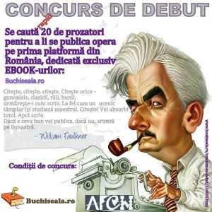 BOOKiseala.ro anunță lansarea primei ediţii a CONCURSULUI DE DEBUT – ediția 2014 – secțiunea proză. Perioada de desfășurare a concursului este 20 iulie – 5 septembrie 2014. Un juriu coordonat de scriitorul şi jurnalistul Marius Ghilezan va decide până în data de 20 septembrie 2014 care sunt câştigătorii. Se acceptă numai manuscrise de proză, de la autori care nu au mai publicat nicio carte cu ISBN până la data de 20 iulie 2014. Înscrierile se vor face exclusiv în format electronic, la adresa de email carteaprinposta@bookiseala.ro. se caută 20 de prozatori pentru pentru a li se publica opera pe prima platformă din România dedicată exclusiv cărţilor electronice. Un proiect susţinut de AFCN (Administraţia Fondului Cultural Naţional) şi sponsori privaţi.