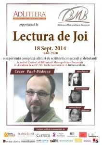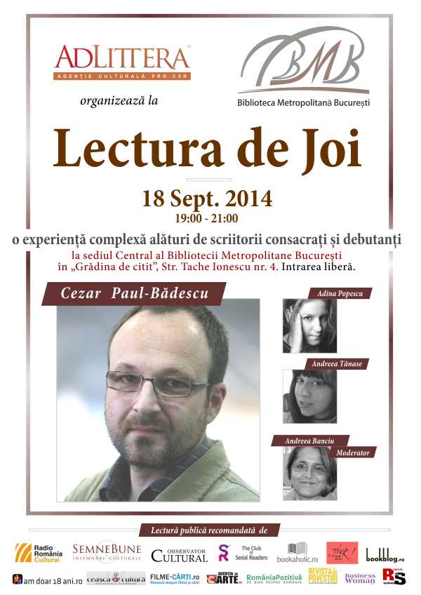 Joi, 18 Septembrie 2014, de la ora 19:00, în „Grădina de citit” a Bibliotecii Metropolitane București (BMB, str. Tache Ionescu nr. 4), În cadrul cele de-a şasea secvenţe (ultima!) a programului „Lectura de Joi”, vor lectura pentru public Cezar Paul-Bădescu, Adina Popescu și Andreea Tănase. Moderatorul acestei ediții este Andreea Banciu.